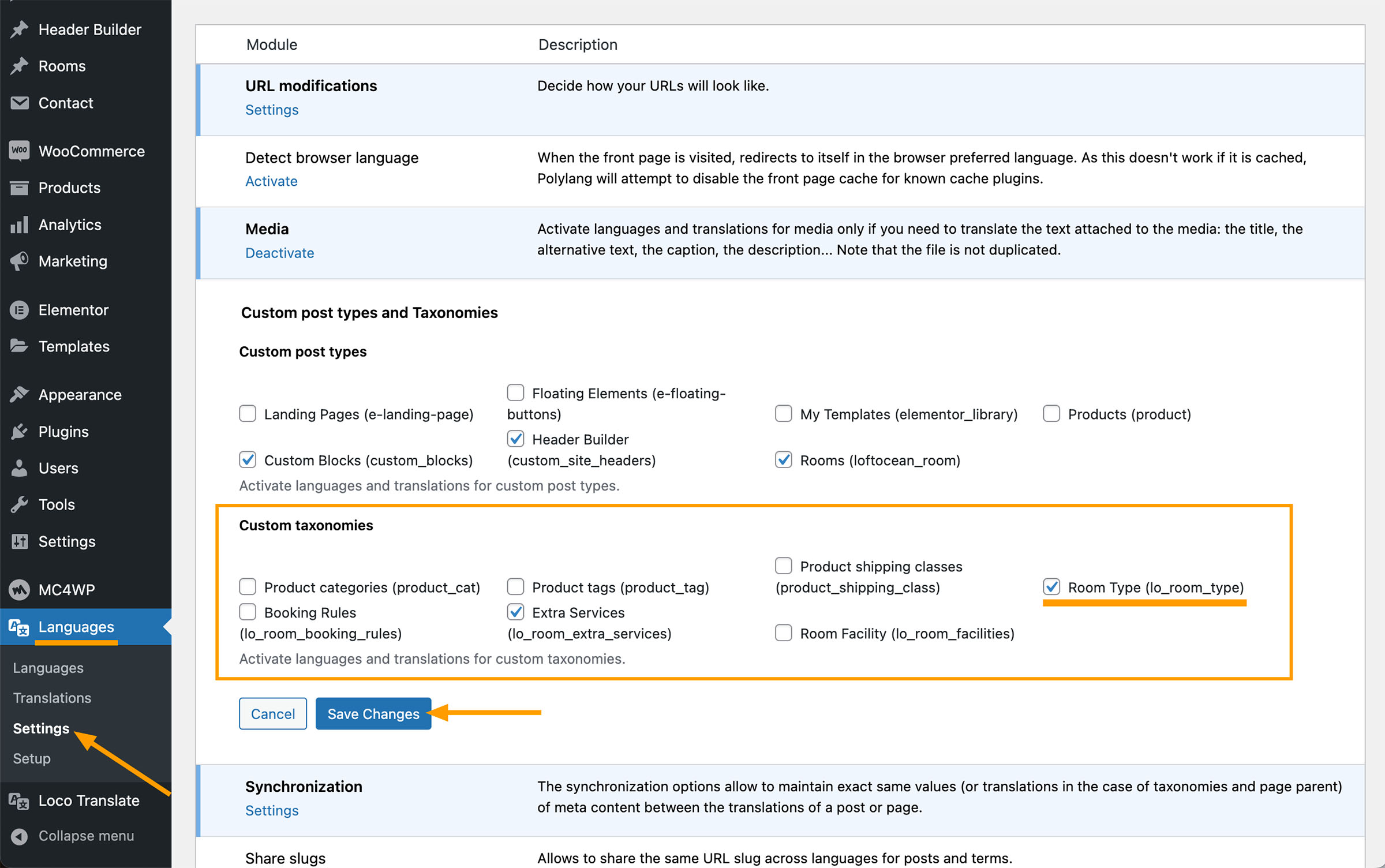 - Please navigate to Languages > Settings, find Custom post types and Taxonomies and click Settings.