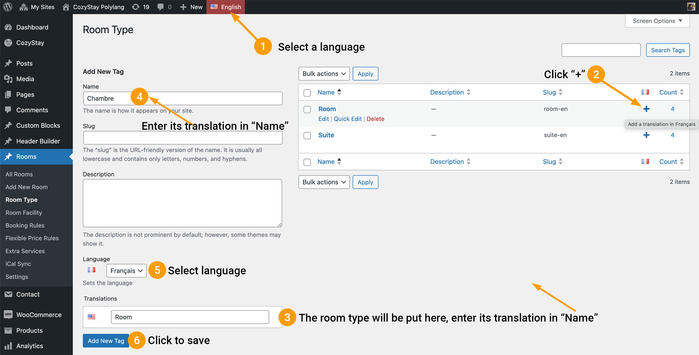 In this tutorial, we will provide simple instructions and key points to explain how to translate your “Rooms” (add multiple language versions for each “Room”) using the third-party plugin Polylang.