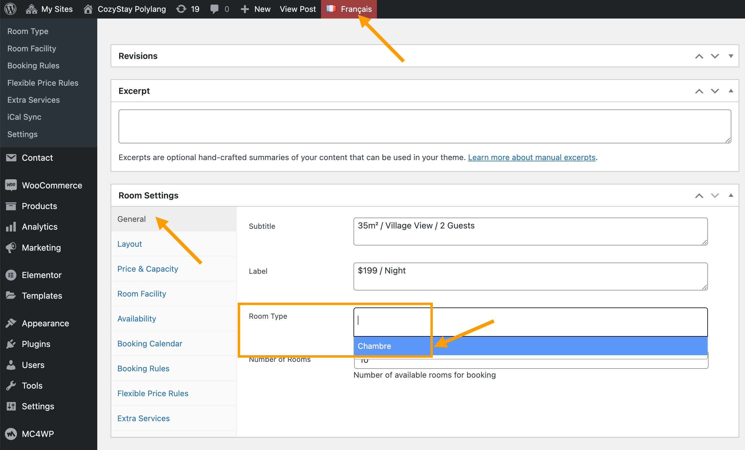 - Then when you edit the French version of a room post, in the “Room Settings” panel > “General” > “Room Type“, you can add “Chambre” as its room type.