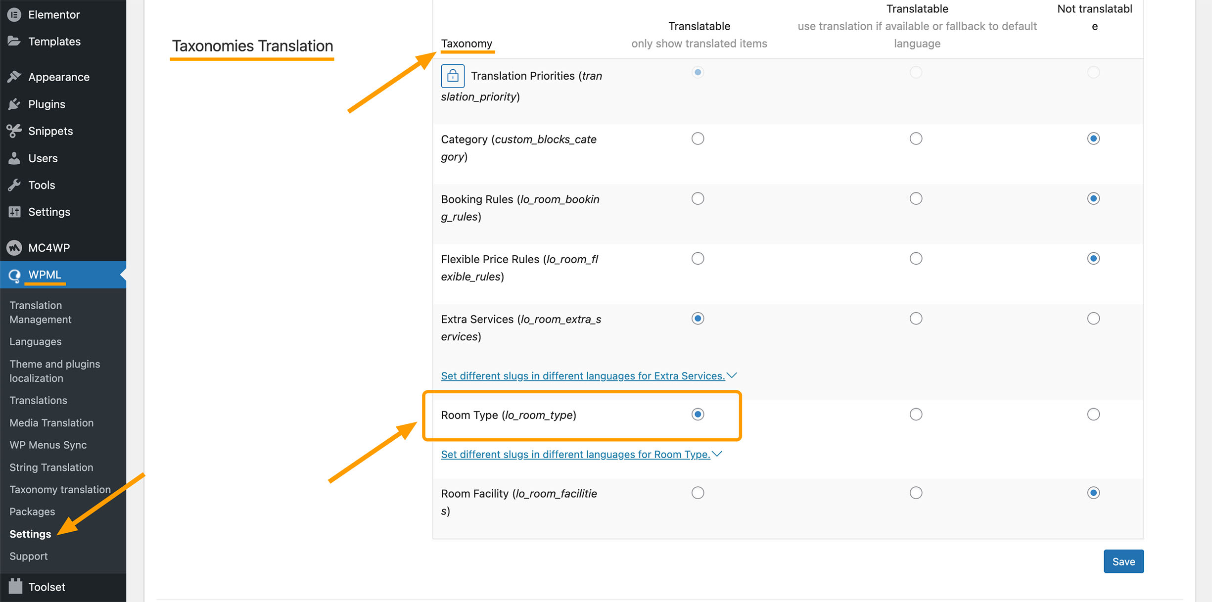 - Navigating to WPML > Settings > Taxonomies Translation, find Room Type, make sure it is Translatable.