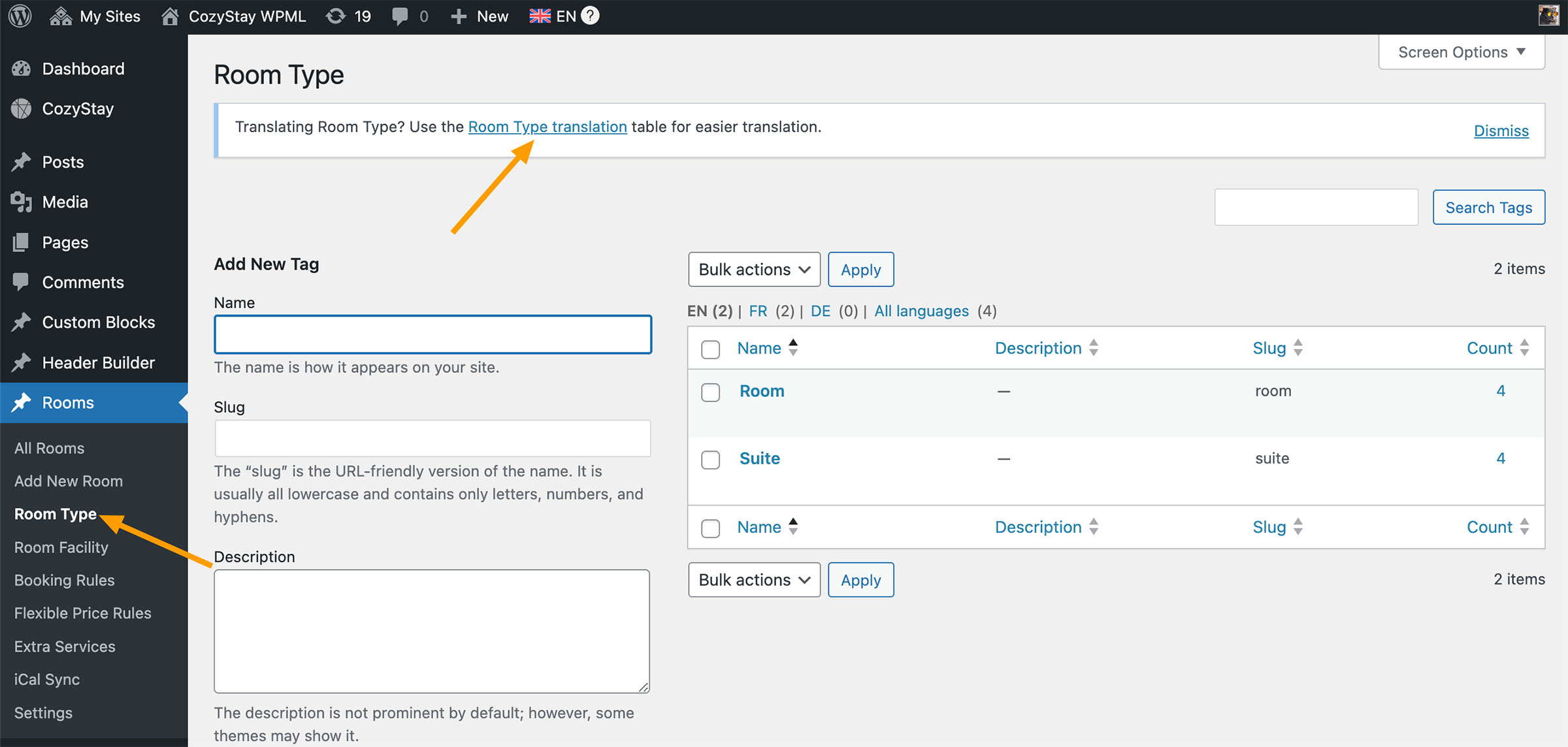 In this tutorial, we will provide simple instructions and key points to explain how to translate your “Rooms” (add multiple language versions for each “Room”) using the third-party plugin WPML.