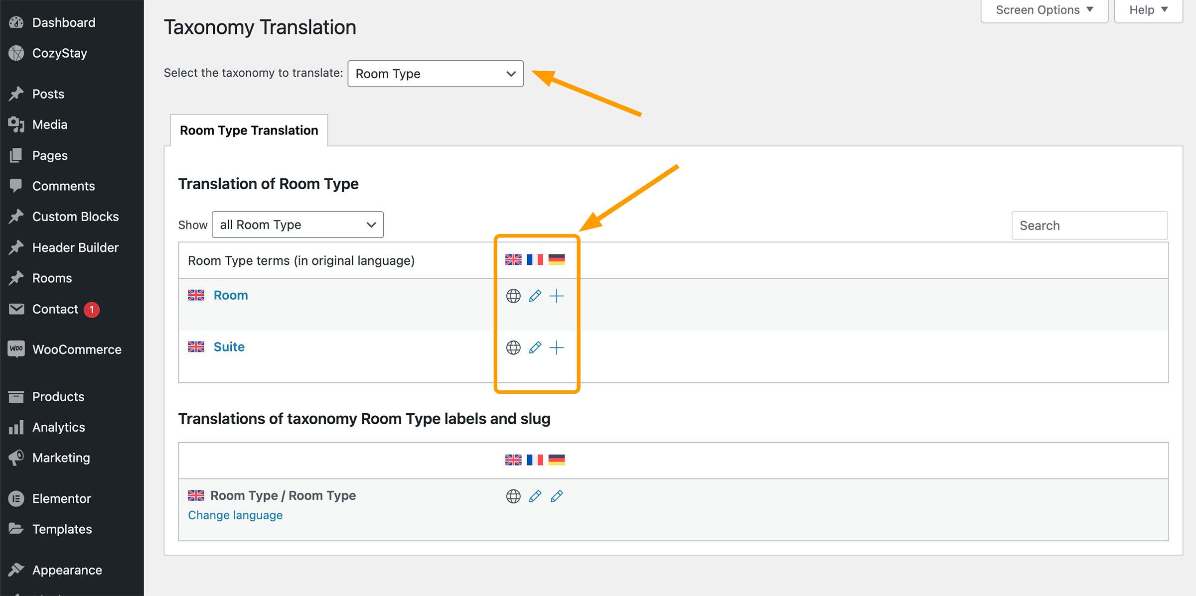 - Then you can navigate to Rooms > All Rooms, you will see a column with flags. Click on the “+” button of the language you are about to translate the room post to. For the translated room posts, the “+” icon will change to a pencil icon. Click on the pencil icon if you need to modify your translation.