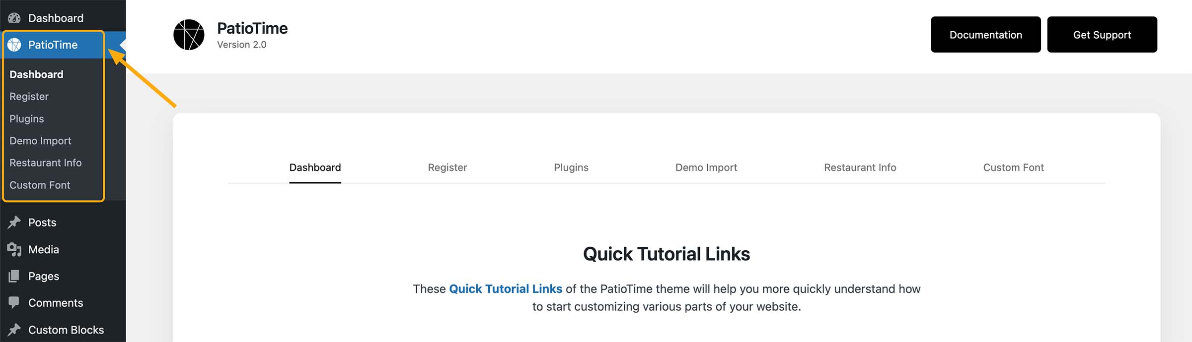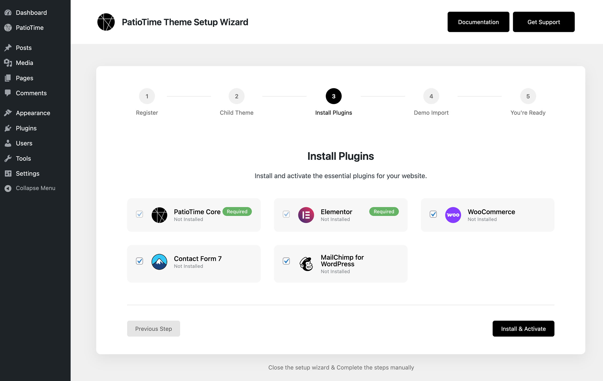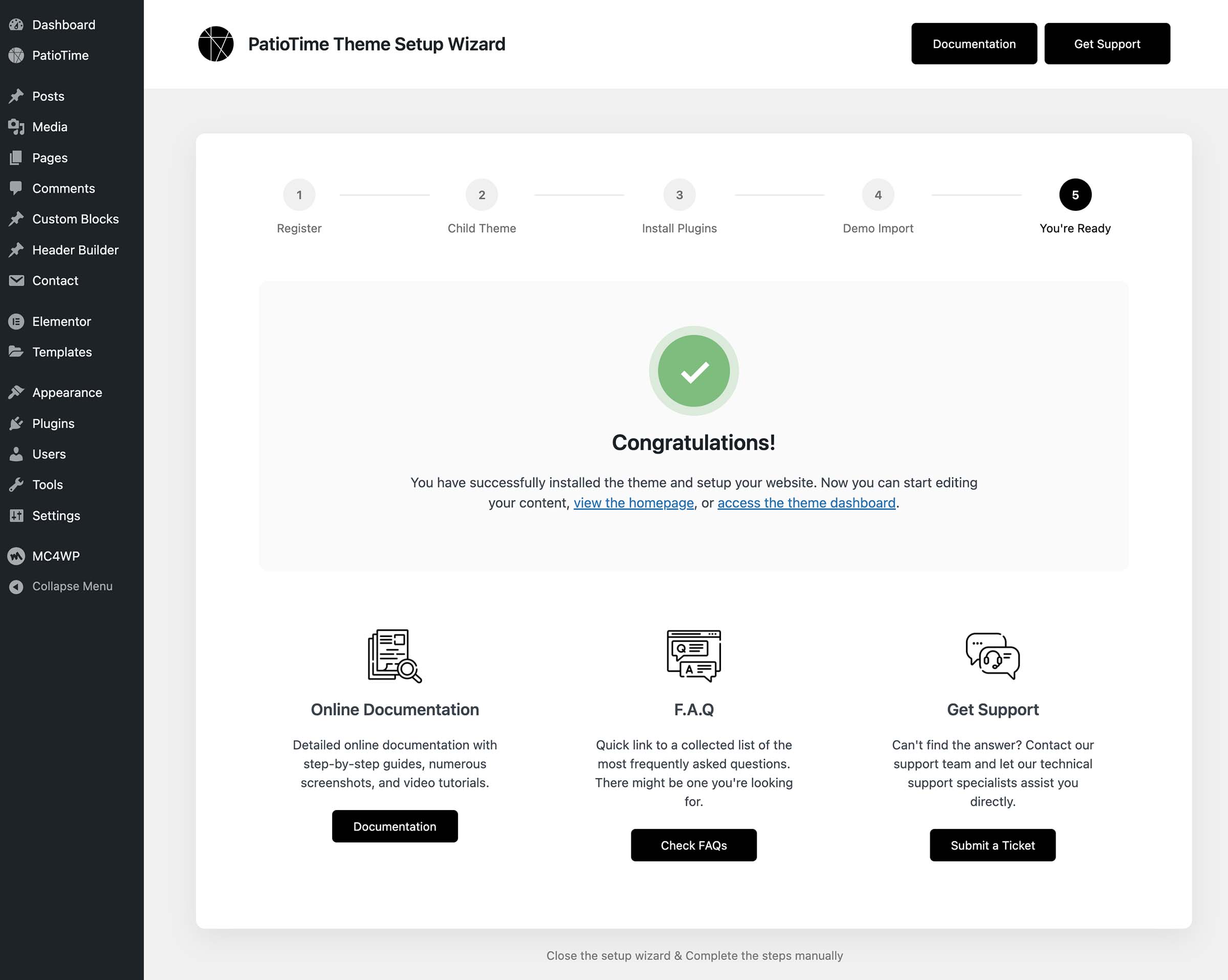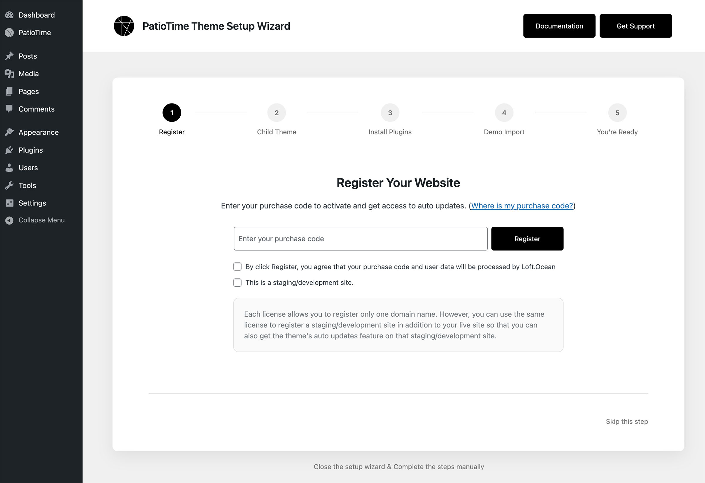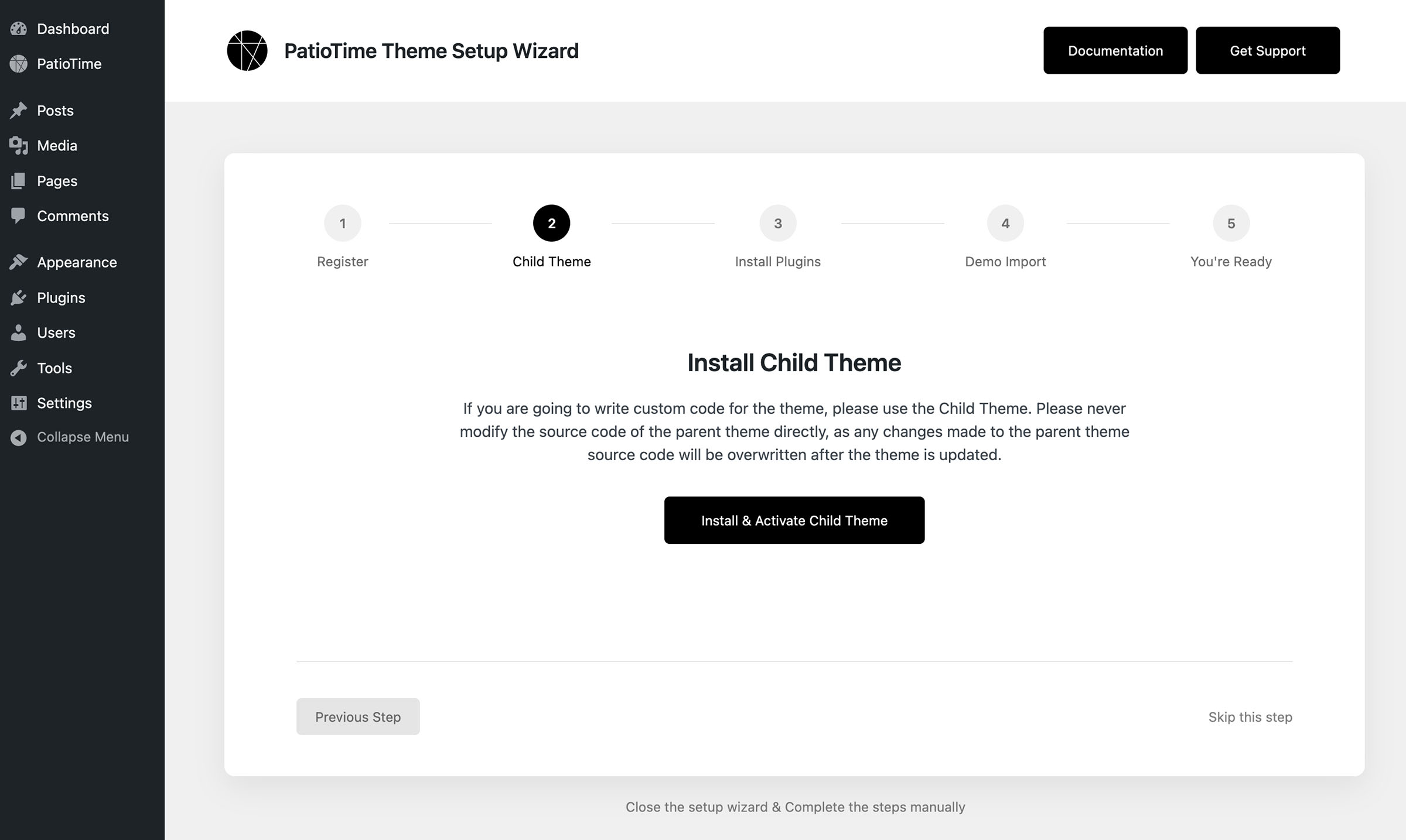After installing and activating the theme, if you’re using PatioTime version 2.0 (or higher), you’ll be directed to the theme’s Setup Wizard.