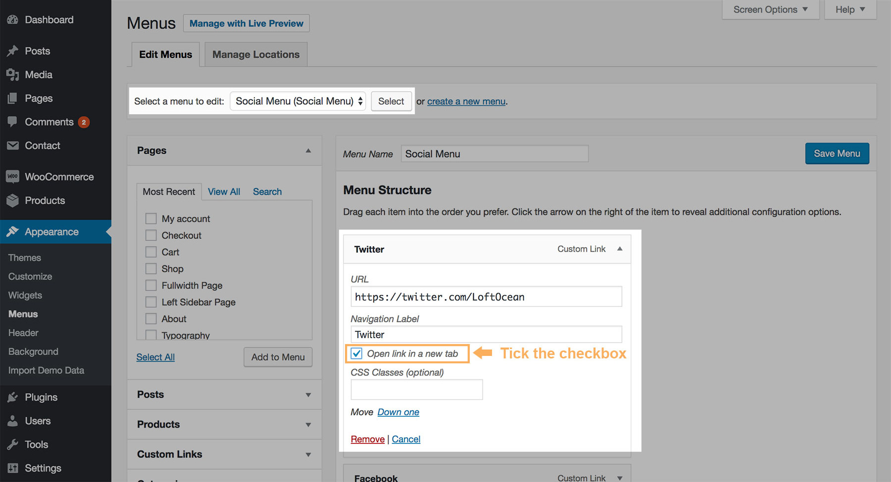 - Find “Custom Links” on the left. Enter the link of your social media site, for example, “https://twitter.com/LoftOcean”. And you can also enter some text into “Link Text” field, it’s optional, and you can enter any text here. Just need to give a correct URL. Click “Add to Menu” button.
