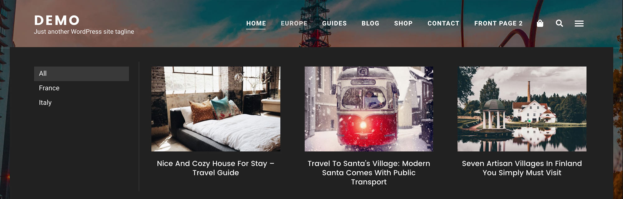 When previewing Eaven theme demo sites, you may see that when you hover the mouse over a menu item, a full-width drop-down menu with several posts appears. Like shown in this screenshot:
