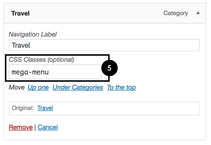 - Then click on the category item in the menu, enter mega-menu into CSS Classes field.