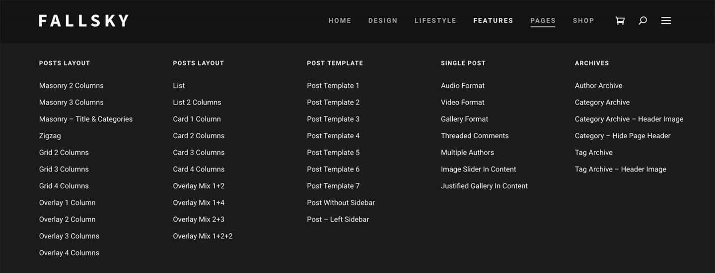 In Fallsky theme, the Primary Menu supports mega menu. And you can show 2 types of mega menus: