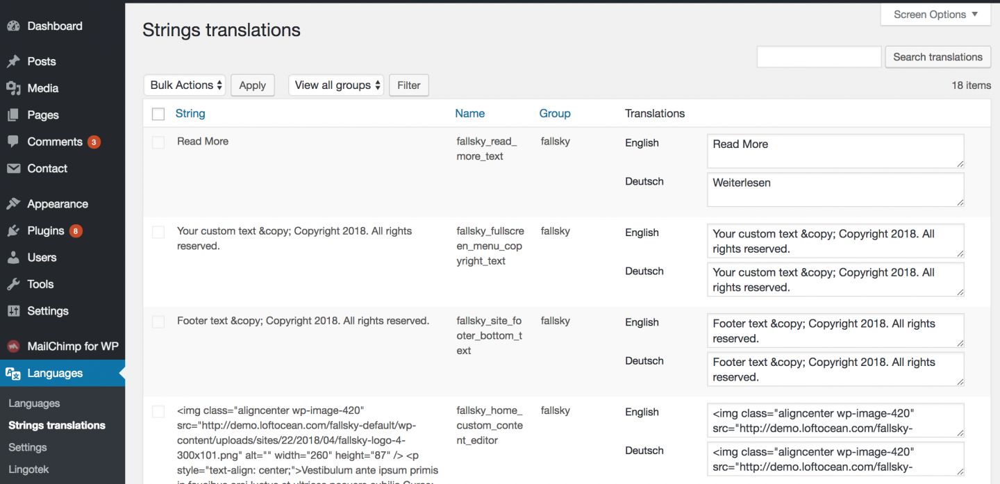 Theme Options Strings: They are strings entered in the theme options (customizer). When customizing your site with Fallsky theme, you will be able to enter many custom text in the customizer. To translate any custom text you entered in the customizer you need to use Strings translations table of the Polylang plugin.